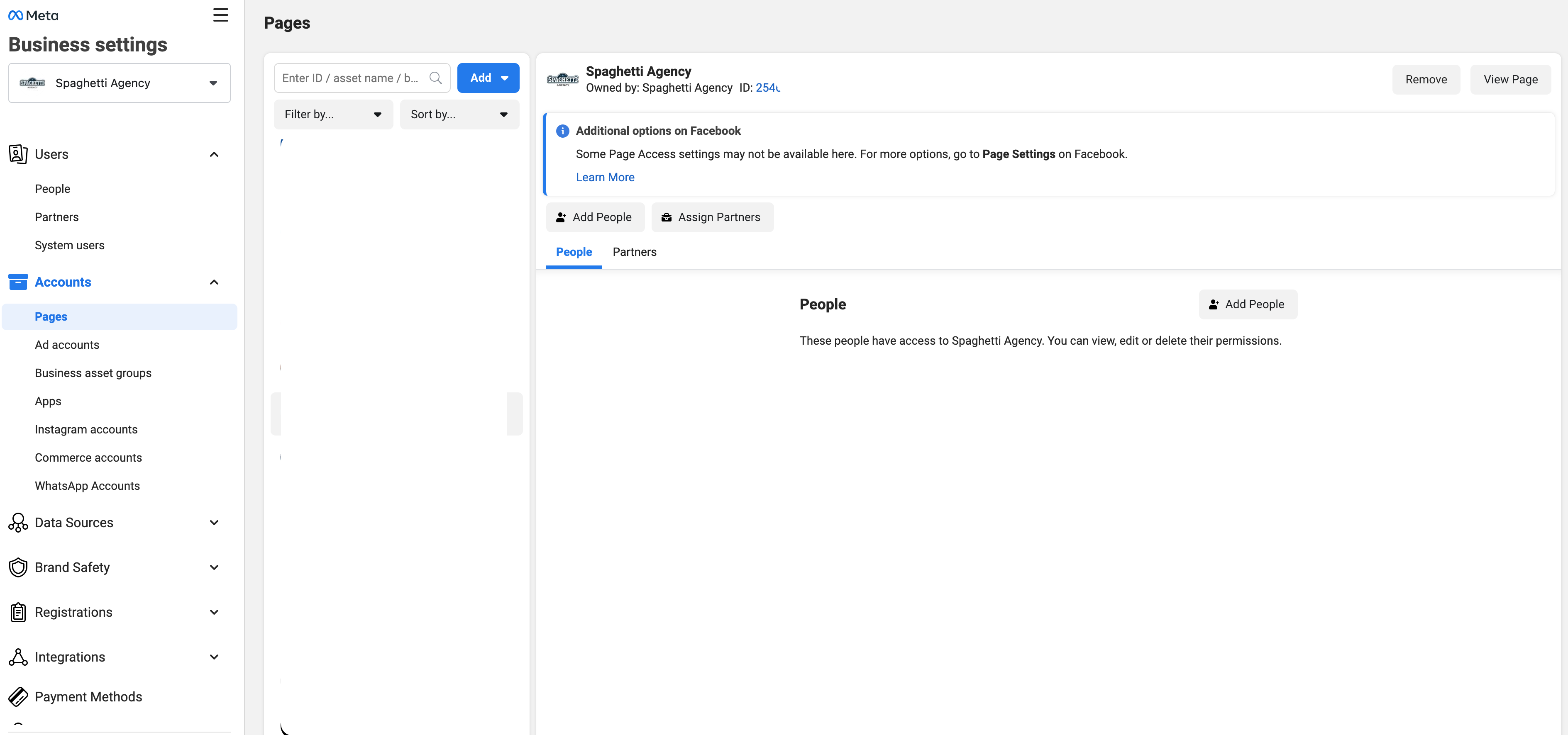 - Ask your outsourced or previous/current agency who looks after social media for you to go to https://business.facebook.com/settings/pages and share what Pages they see there. Again, they often mistakenly take ownership of Page. We see this a lot. Ask them to remove the page and this will give it back to you (ONLY if you’re an admin elsewhere!).