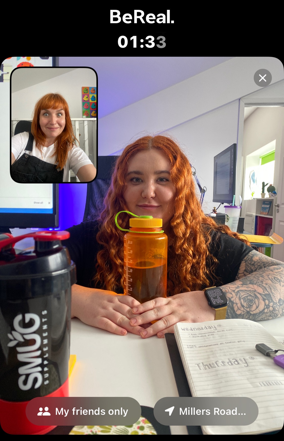 Basically, BeReal is a photo-sharing app. Every day, at a random time, it sends you a notification to snap a real-life, unfiltered photo – one with your front-facing camera, to get your overall vibe, and one with your back-facing camera, to show what you’re doing or who you’re with. You only get two minutes to take your photo, so no time to pop on some lipstick or tidy up your desk.