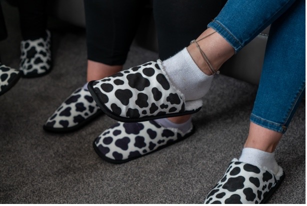 Our dress code is very relaxed: dress in whatever feels comfortable to you, whether that’s jeans, pyjamas, or a cosy jumper. We want you to be able to be free to express yourself. And new starters are welcomed with cow print slippers and a personalised water bottle to drink from.